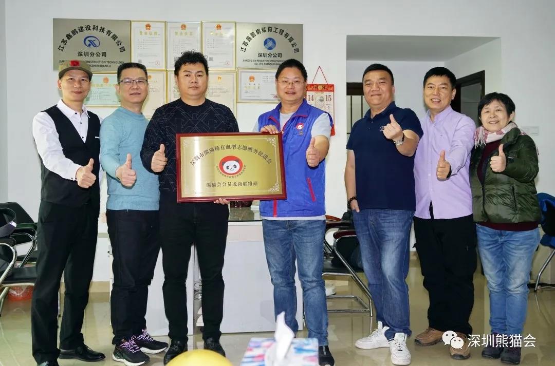 1月14日下午,熊猫会理事成员及会员在横岗深峰办公楼B302室为江苏鑫鹏建设科技有限公司颁发爱心企业牌匾。